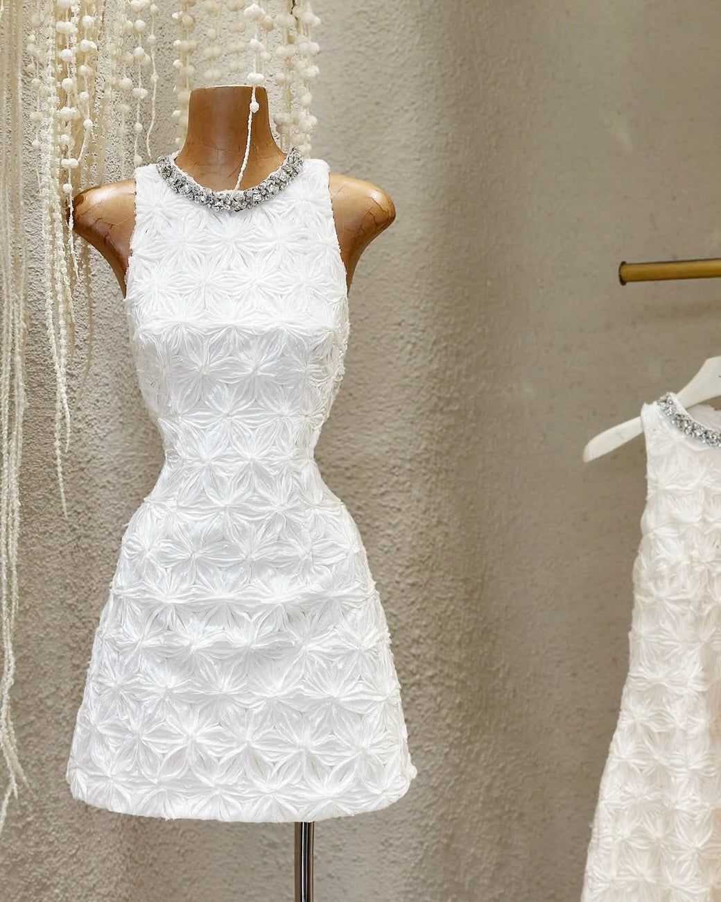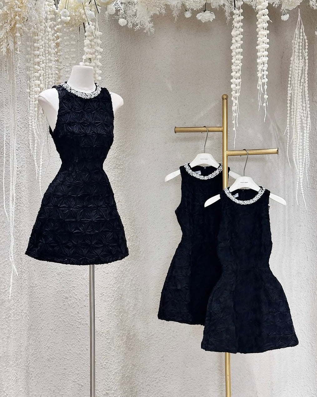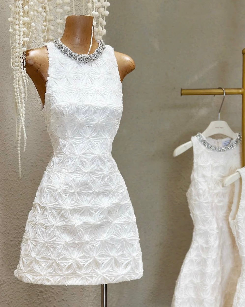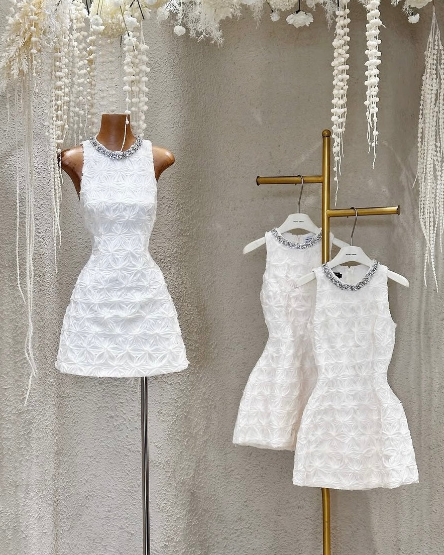The Adelaide Dress is sculpted in dreamy floral textures — crowned with a jeweled neckline that catches the light, for a refined sparkle that whispers luxury in every step.