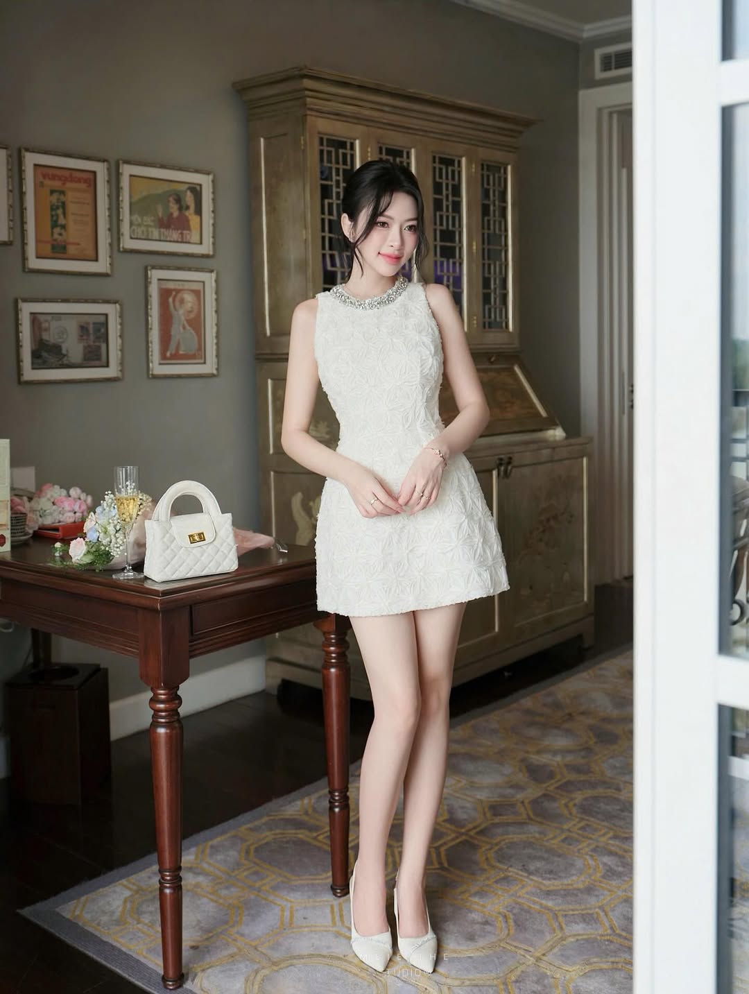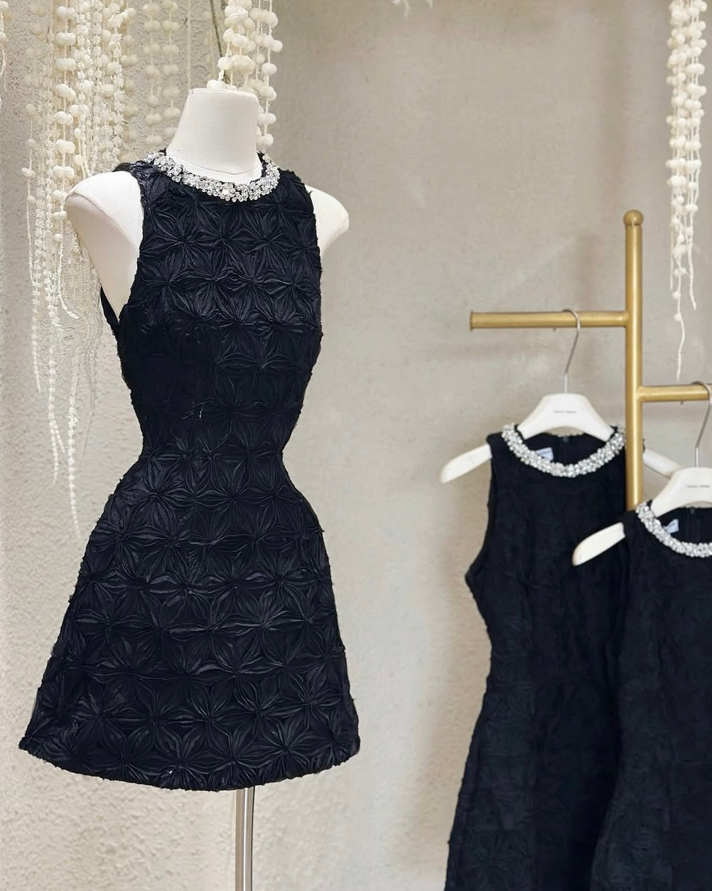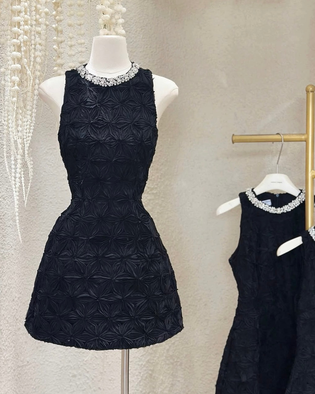 The Adelaide Dress is sculpted in dreamy floral textures — crowned with a jeweled neckline that catches the light, for a refined sparkle that whispers luxury in every step.