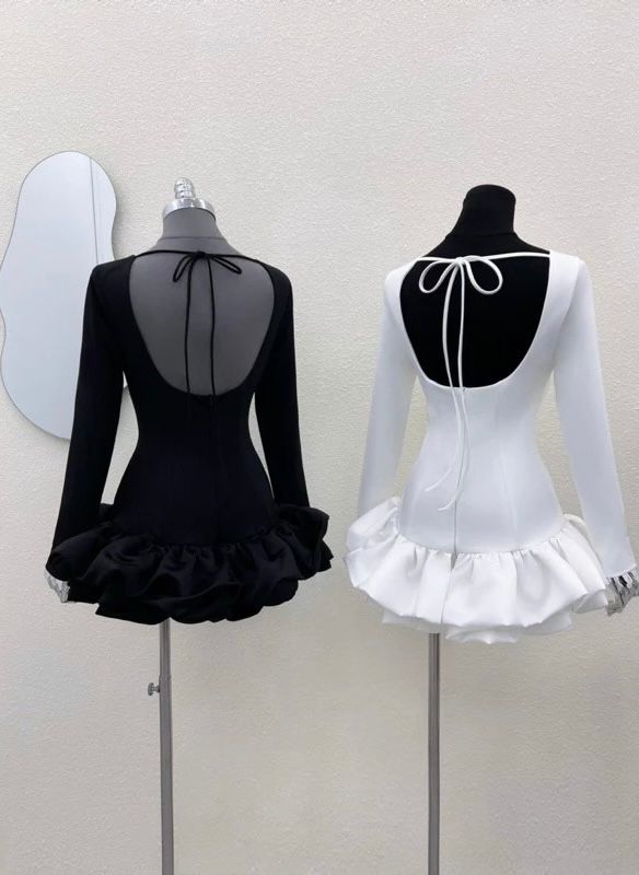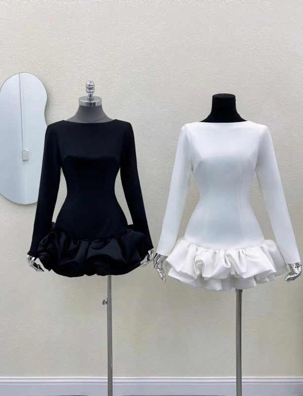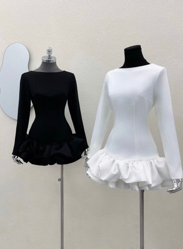 Make a bold statement with the Amber Dress, a stunning piece designed for both elegance and flair. This long-sleeved mini dress features a fitted bodice that beautifully contours the figure, balanced by a unique ruffled hemline that adds volume and charm. The Amber Dress combines simplicity with sophistication, making it perfect for formal events, cocktail parties, and memorable evenings out.