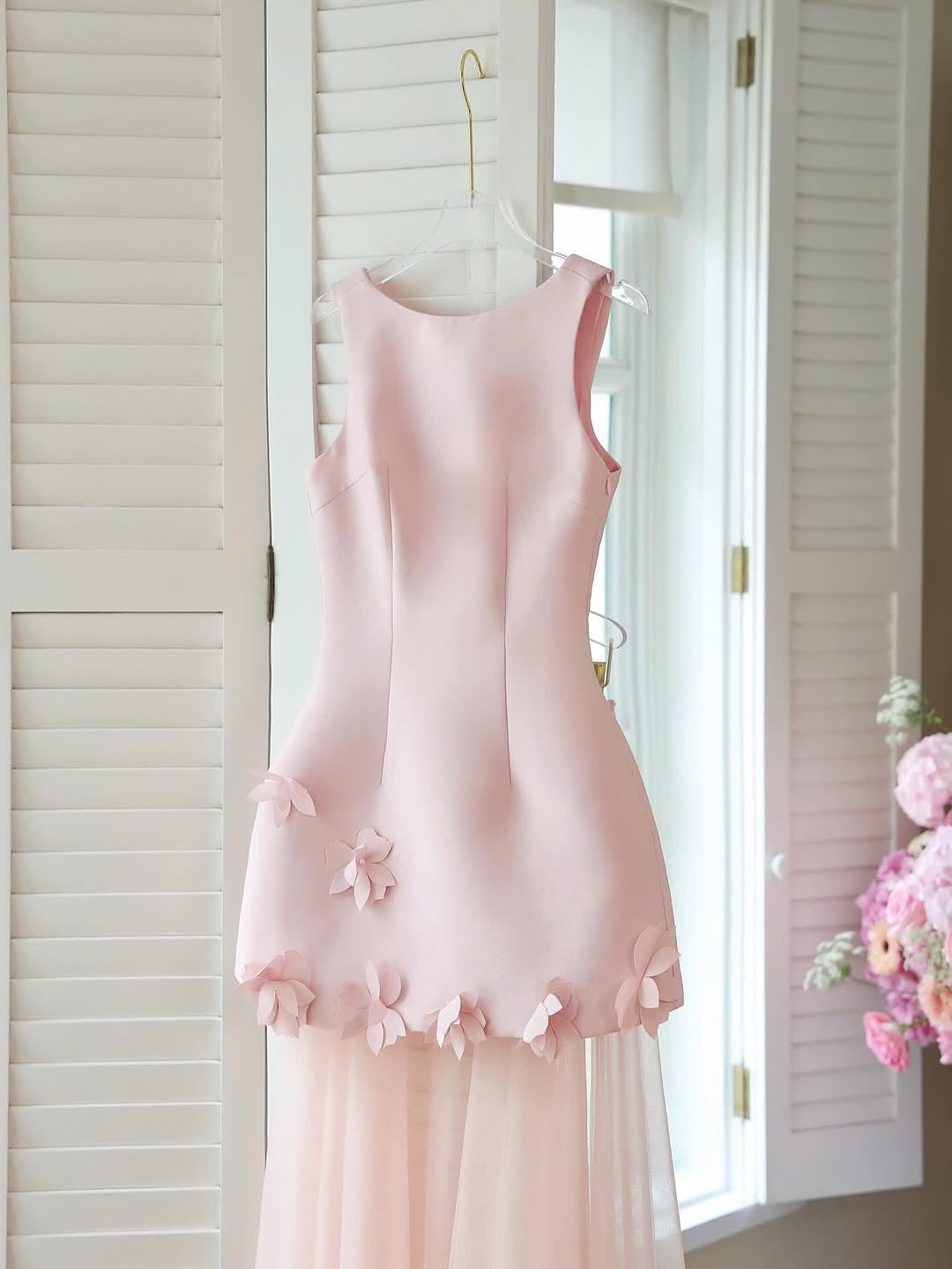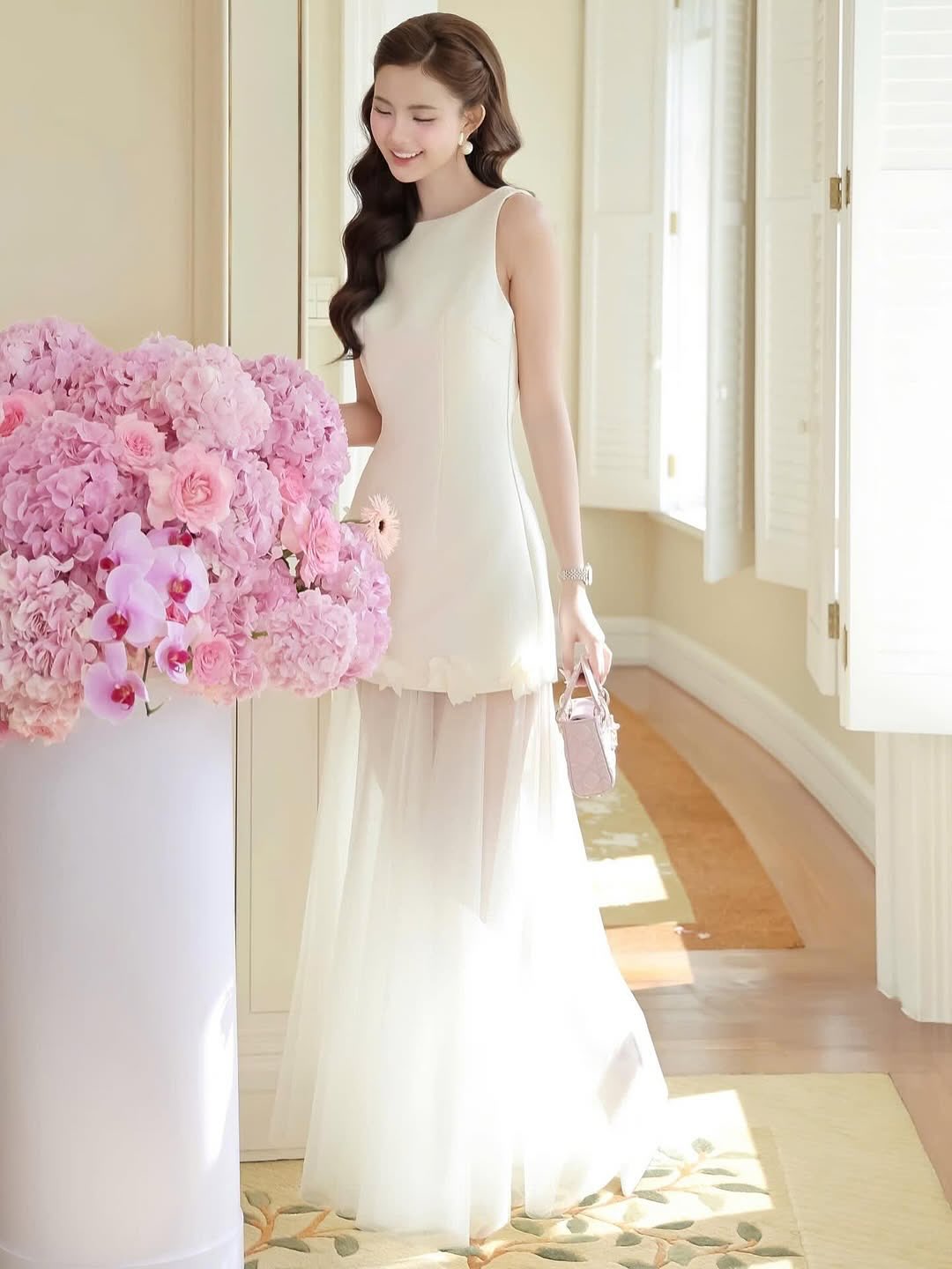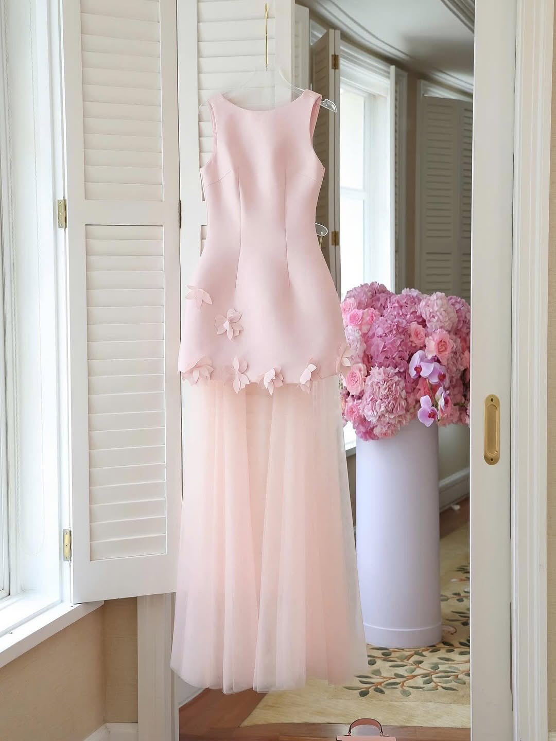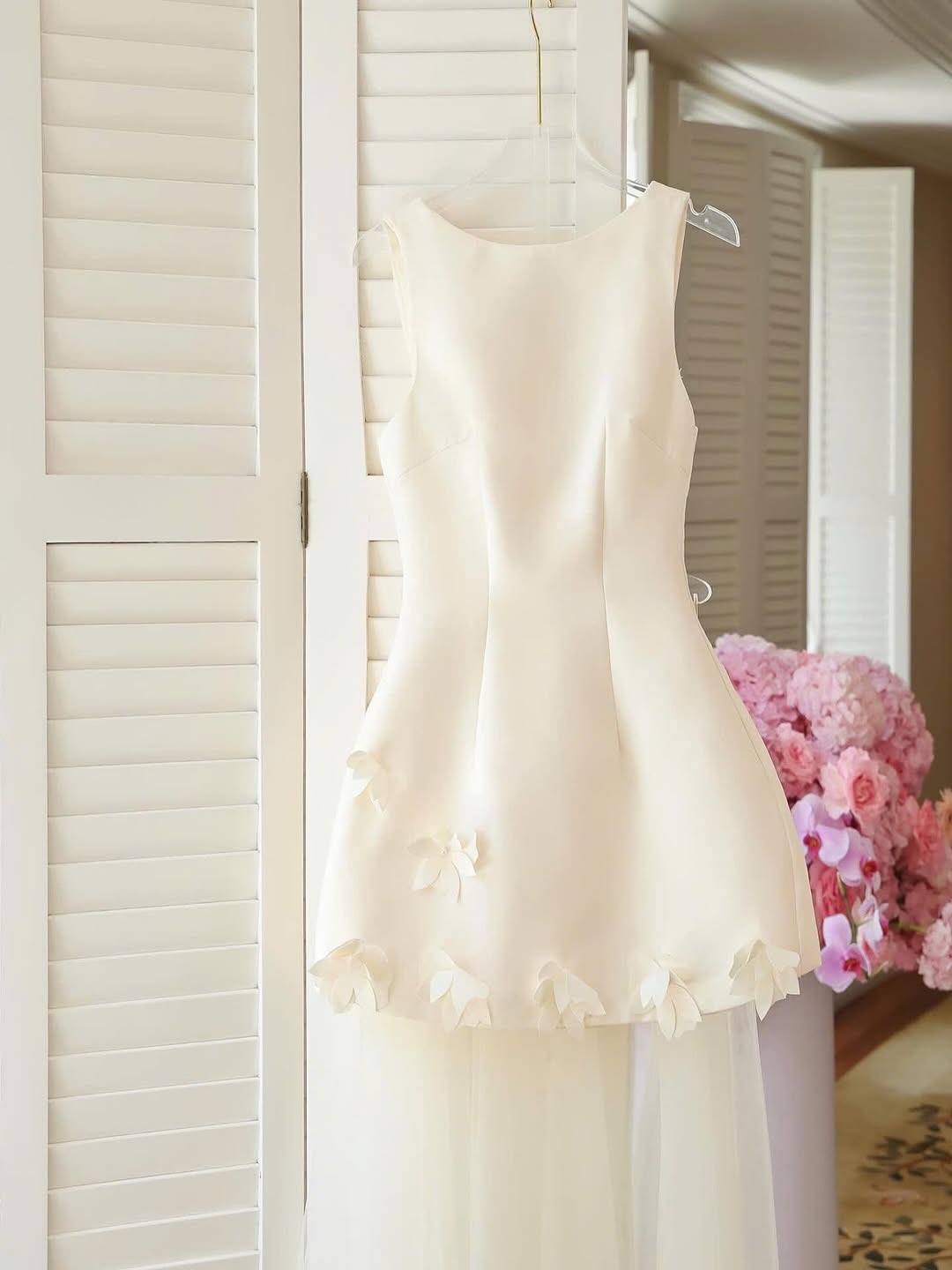 The Charadine Dress is framed with hand-crafted floral appliqués along the neckline — paired with a sleek, sculpted silhouette that celebrates timeless femininity with a touch of modern allure.