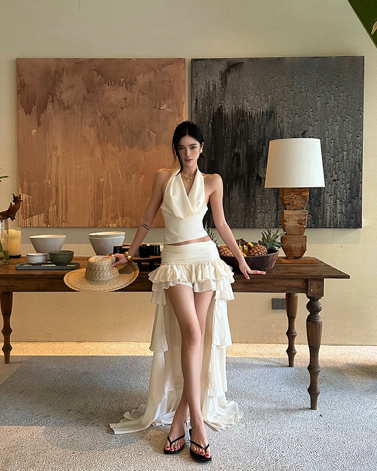• Layered ruffle skirt with dramatic high-low cut
