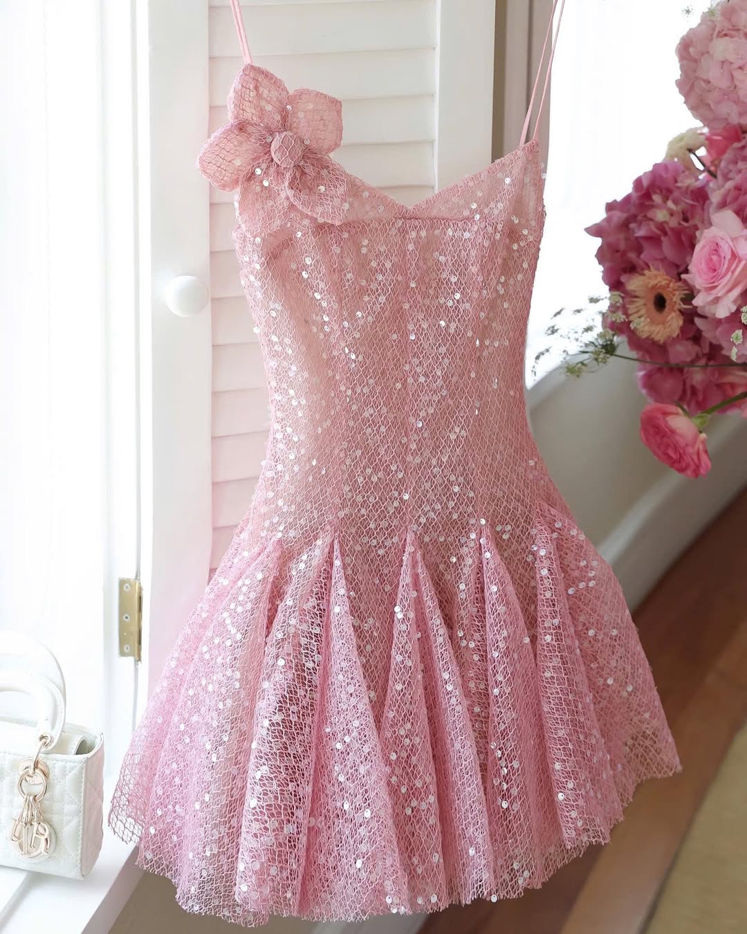 The Donna Dress is framed with hand-crafted floral appliqués along the neckline — paired with a sleek, sculpted silhouette that celebrates timeless femininity with a touch of modern allure.