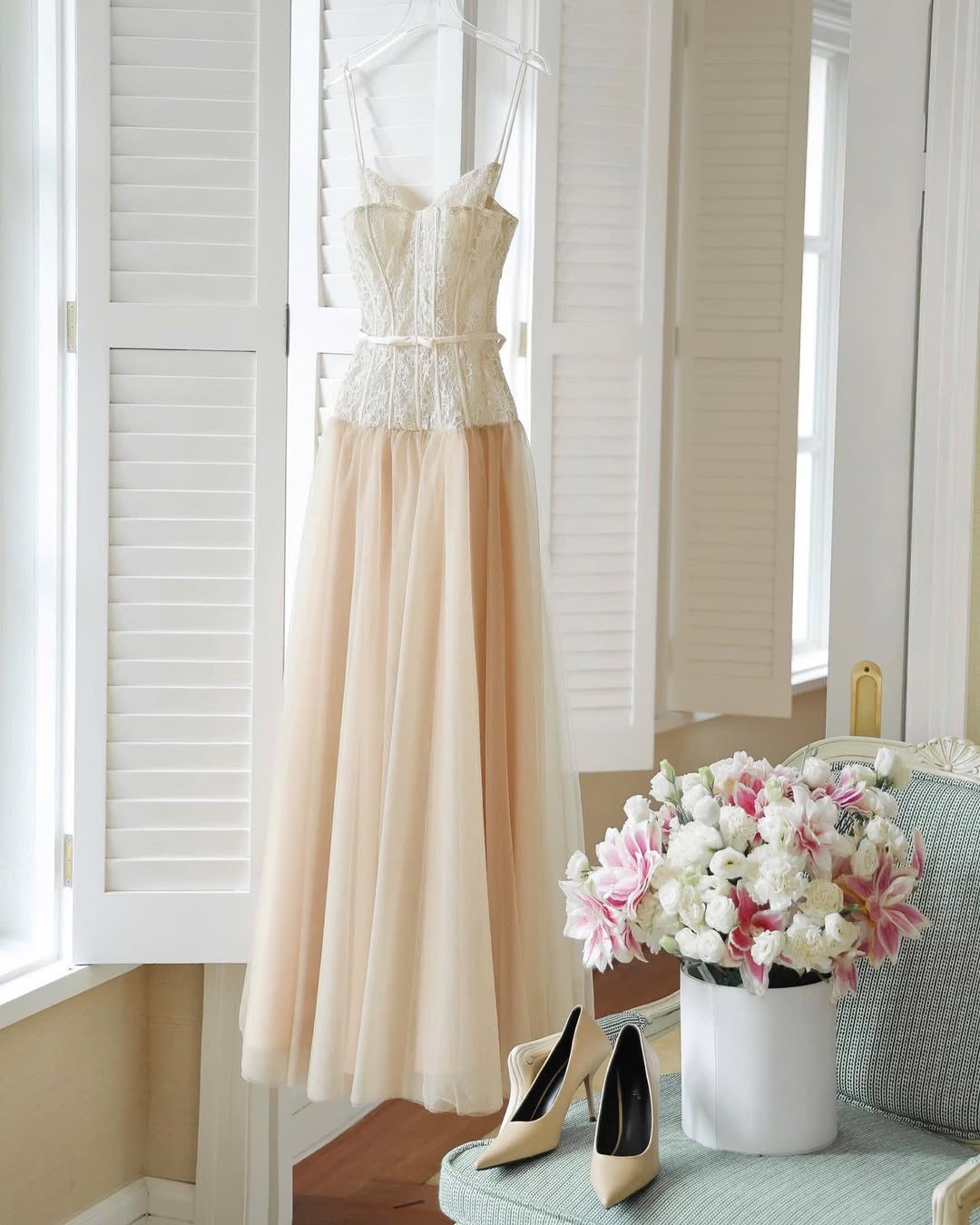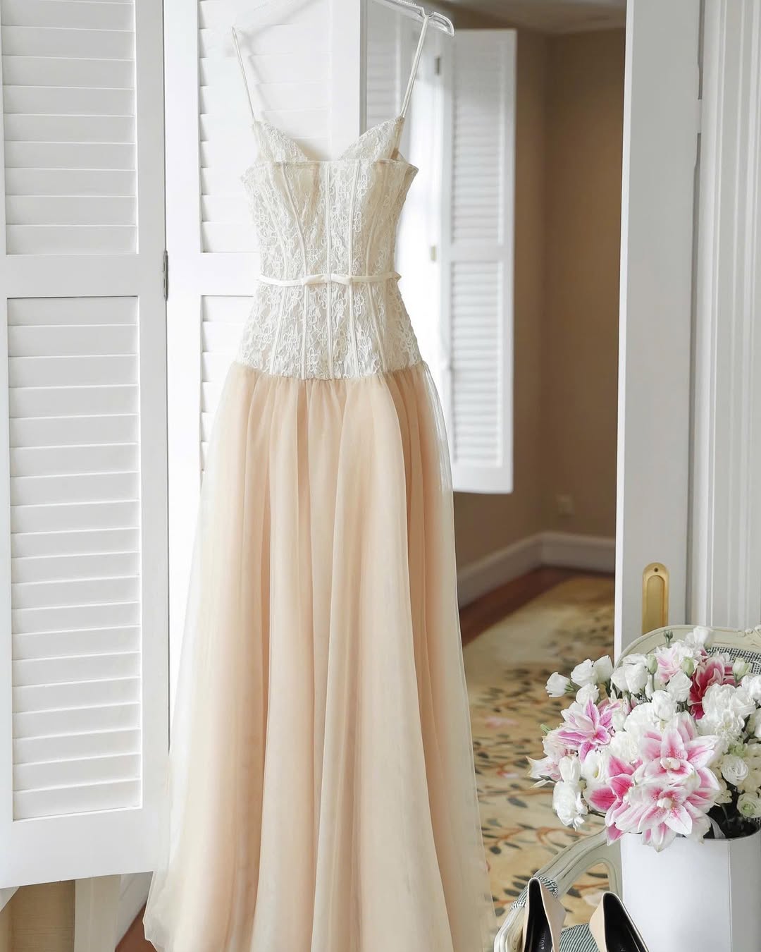 • Sculpted lace bodice with floral embroidery for a romantic, structured fit