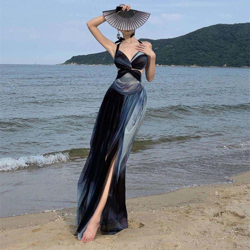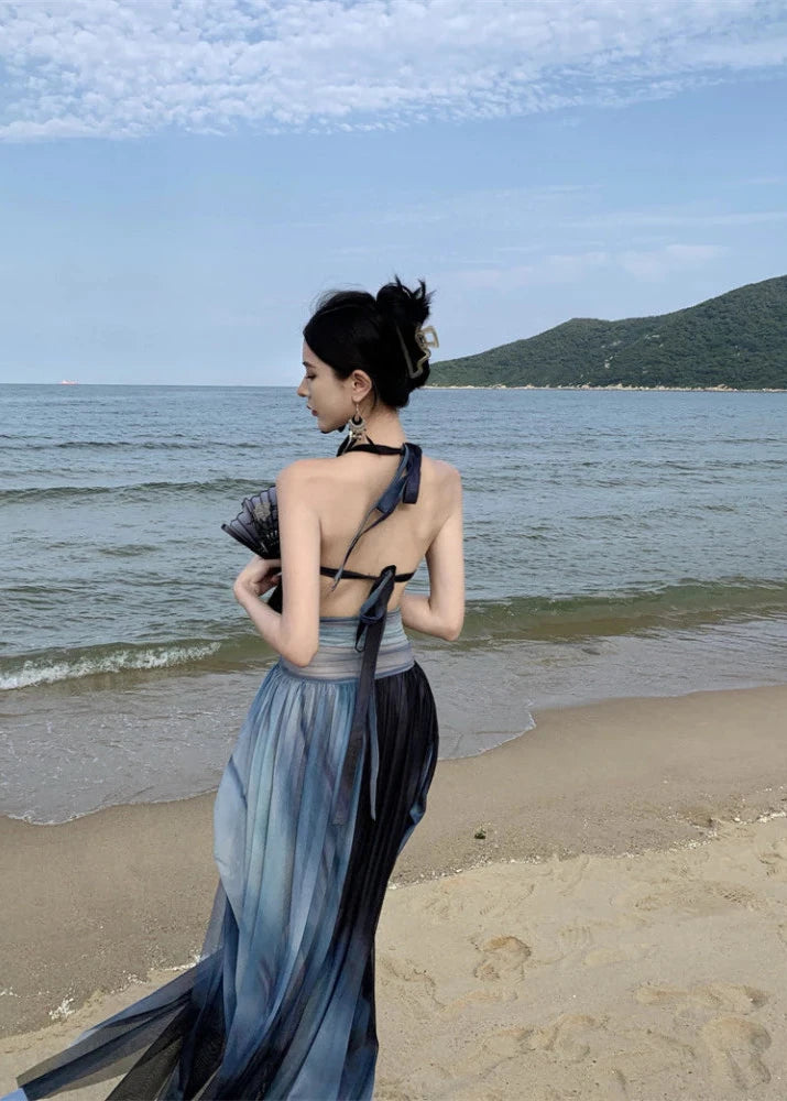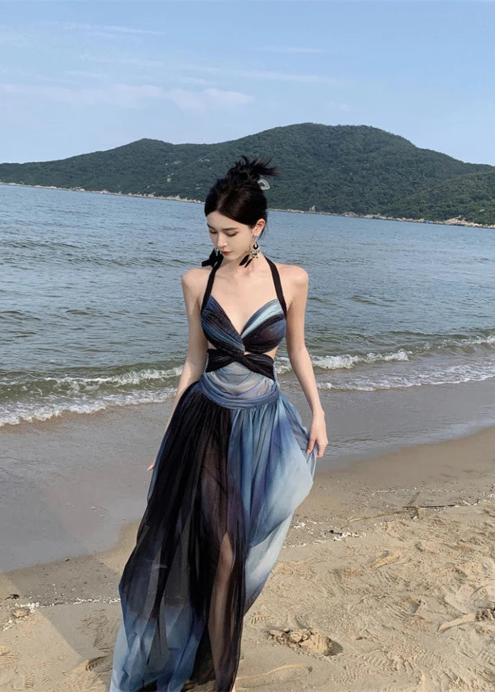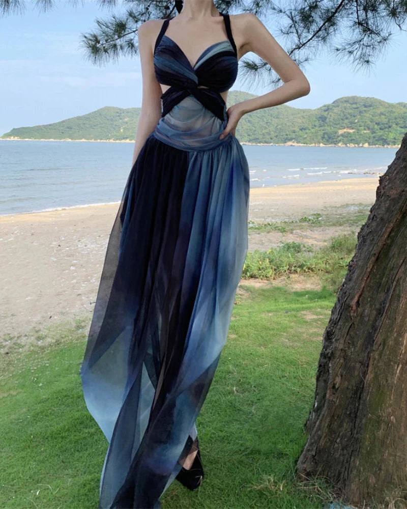 The Saylor Dress brings ocean waves to life with its cascading hues and elegant silhouette. Whether it's a yacht party or a beachside dinner, this dress is your moment.